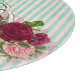 Fun and fancy round cutting board features a pink and aqua striped background, pink and burgundy tint floral bouquet and vintage Alice in Wonderland Cheshire Cat illustration.
