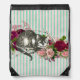Fun and fancy digital collage features a pink and aqua striped background, pink and burgundy tint floral bouquet and vintage Alice in Wonderland Cheshire Cat illustration.