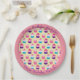 Fun, colorful paper plates have a pale yellow background and a pattern of pink, blue, white and purple fancy, cupcakes, decorated with rainbow sprinkles, strawberries and cherries. They have a pink border which says Happy Birthday and you personalize with the birthday girls' name. Want to use the plates for a different occasion? You can personalize the text to suit your needs. You only need to personalize it once and both the top and bottom will update.