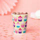 Fun, colorful paper cups have a pale yellow background and a pattern of pink, blue, white and purple fancy, cupcakes, decorated with rainbow sprinkles, strawberries and cherries. There are matching plates, napkins, wrapping paper and other items that will make the perfect birthday party!