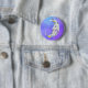 This round pin back button has a fancy white crescent moon with a face that has blue eyes and pink lips and brightly colored abstract shapes in purple, blue, and yellow.