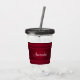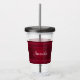 An acrylic tumbler with a red background decorated with elegant swirls and ornamental designs along the borders.