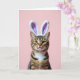 This design shows a striped tabby cat centered on a soft pastel pink background, dressed in fuzzy white bunny ears with pale lavender inner lining 🐰. The cat’s rich brown-and-black fur pattern is shown in crisp detail, and its golden eyes meet yours with a tender, almost teasing look that feels like a quiet inside joke between close friends. Gentle lighting smooths the scene and brings out the plush texture of the ears, the small pink nose, and the fine whiskers fanning from its muzzle. Near the top, a short Easter greeting sits in simple lettering, set in a light lavender color that echoes the ear lining 🌷. A smaller line of text is placed near the bottom in soft gray, leaving plenty of open space around the portrait. The background stays uncluttered, keeping attention on the cat’s face and the cozy costume details. The bunny ears sit slightly tilted, with the white fur catching a soft highlight along the edges.