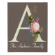 Beautiful and fancy florals include gold leaves, purple rose and blue wildflowers embellishments on large light colored letter / initial A. Brown background with customizable text. Add family name or other special wording.