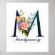 Beautiful and fancy florals include gold leaves, purple rose and navy blue wildflowers embellishments on large letter / initial M. White background. Customize with first/last names