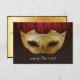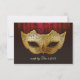 Fancy Flourish Gold Masquerade Wedding Invite. A classy and sophisticated masquerade mask RSVP card for all your guest to let you know their status of attending your wedding. The mask is featured here in gold tones with fancy black flourishes over it and a fancy flourish background in gold tones and black.