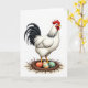 Perfect for sharing, a tall white rooster stands proudly against a plain white background, its deep charcoal tail feathers curving upward like a gentle flourish. Bright red comb and wattles frame its face, and a golden beak and watchful yellow eye give it an attentive, slightly tender look, as if it’s guarding something dear. Soft gray shading along the neck and wings adds depth while keeping the overall look light and airy, with a small 🌷 touch of spring implied in the styling. Centered below the bird, a dark twig nest sits under its golden-yellow legs, creating a cozy little stage for what it’s protecting. Inside the nest are three decorated eggs: one warm orange with thin white stripes, one aqua with cream geometric patterns, and one teal with curling gold swirls 🐇. Any greeting text would sit neatly above the rooster in a soft gray tone, with a shorter line below the nest in matching color for balance. The eggs’ patterns are crisp and detailed, and the nest’s tangled branches form a dark ring around them.
