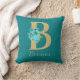 Pretty throw pillow features gold glitter letter 'B' with aqua roses and gold floral bouquet on a teal background. Personalize with name in gold colored font.