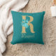 Pretty throw pillow features gold glitter letter 'R' with aqua roses and gold floral bouquet on a teal background. Personalize with name in gold colored font.