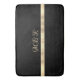 Personalize with your monogram in fancy gold script and name on brushed gold stripe on black background.