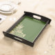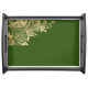 Fancy servingware design features gold rose blooms and leaves on dark green background.