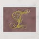 Fancy royal elegant monogram letter T in golden yellow on a cloudy background (can be deleted) placed on a colored background that can be changed too to any desired color or deleted entirely and replaced with a personalized photograph. Every letter of the alphabet is available on postcards with matching postage stamps in my Gallery. In addition, greeting or note cards are available while on the stamp image of the monogrammed letter of your choice.