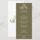 A fancy and retro luxury boho bright wedding dinner menu. Which features chic old money template design of old money vintage olive green old money background and white typography and fancy menu. Perfect and matching with the whole suite.
