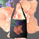 This striking crossbody bag features closeup a fancy orange Hibiscus flower with purple flowers and green leaves. This vibrant tropical flower is displayed on this dramatic black tote bag. Feel the Tropics in this bright and colorful floral and easily personalize with your Name.