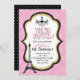 This Paris theme party invitation is fancy and fabulous with pink damask patterns, black and white polka dots and gold glitter-style design! Personalize this invitation for any Parisian theme event with all of your party details!