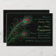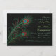 A dramatic invitation in black with two, vibrant peacock feathers.