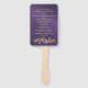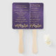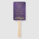 Elegant formal wedding program fan done in a trendy violet purple shiny damask look, with graphics of a gold flourish decoration, on the bottom. Personalize the text, on both sides of the fan, for your wedding day.
