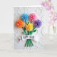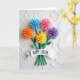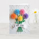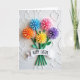 This design shows a bouquet of five fantasy-like flowers built from many tiny radiating pieces, giving each bloom a spiky, pom‑pom texture that feels like a friendly hug in floral form 🌷. The flowers are colored sky blue, fuchsia, sunny yellow, orange, and soft lavender, each on an emerald green stem with small, simple leaves, gathered close together like companions leaning in for a photo. The background is off‑white with faint pressed patterns that suggest seasonal motifs without stealing attention from the bouquet. A white banner wraps around the stems, adding a gentle “arms-around-the-waist” kind of closeness to the arrangement 🐇. Centered on that banner is a seasonal greeting in dark ink, set in a casual handwritten look that stands out clearly against the white strip. Bright, even lighting highlights the textured petals and creates soft shadows that give the flowers a raised, three‑dimensional look. The greeting text sits across the middle on the banner, while the colorful blooms fan upward above it and the green stems taper downward below it.