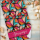 An overall abstract pattern of fantastical style flowers in shades of turquoise, berry, pink and orange accented with black, this colorful design is a fun and recognizable beach towel for your next vacation or pool visit. Personalize with your name or a location.