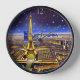 Clock in a semi-abstract aerial view of Paris, brightly lit, under a dark blue starry sky