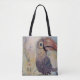 A colorful toucan with a large beak is depicted against a soft-hued background featuring delicate flowers. It appears perched, with its feathers rendered in a textured manner, giving the bird a lifelike and vibrant presence. Nature pals in print -- GardenGoonies -- Fantasy Bird Tote created from original acrylic art -- Spread one laugh at a time