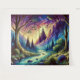 This vibrant stained glass–style design captures a magical landscape with a glowing castle rising between violet mountains at sunset. A winding river shimmers in shades of blue, framed by tall evergreens and graceful trees arching overhead. The rich palette of purples, golds, and emerald greens creates an enchanting, dreamlike atmosphere, evoking a sense of wonder and fantasy.