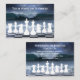 This stunning fantasy chess business card design features a chess board partially submerged in the sea with waves crashing onto the board with a line of chess pieces in the sea foam. The setting is a night time and features a stunning night sky. Perfect for professional or personal use.