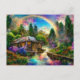 Fantasy cottage with rainbow and flowers postcard