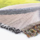 A quality printed throw has its advantages. This is a much finer weave throw than its loopier cousins, and though lighter, it is worth the investment for custom room accessorizing. The back is much prettier than the typical brown, and the fringe on the long sides very vivid, the selvage nicely done. Before photographing, I washed the throw in cold water, delicate, with a thicker woven throw the same size. On tumble dry low, this throw was dry in half the time as the other. This is a very practical quality if you use throws for furniture covers or to wrap up in frequently. The sleekness of the fabric makes it a great layer for accenting or protecting without the feeling of sitting on too much stuff. Perfect for napping or when you feel a light chill coming on. The color printing is beautiful and on this fabric, matched the design and color of my Photoshop image. This is an advantage for blending room fabrics and colors. The fringe on the short sides prints the colors from the design image and therefore varies from the side fringe. I streaked a white fractal line through the plaid pattern to give the illusion of weaving. This printed as crisp as an illusory thread, and put some white in the short side fringe, showing another advantage of print vs loomed- for artistic purposes, line lines, detail, and color integrity can be planned and preserved. My loomed throws have color limitations and more of a needlepoint texture. Print throws reproduce an exact image. The throw felt a little stiff straight out of the package, but this went away in the first delicate wash. Of course I searched the wash water for ink or bleeding and there was none.