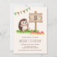 Adorable kid's birthday invitations featuring a cute cheerful hedgehog, green grass and colorful mushroom on the floor, party flag and a wooden board with the number.