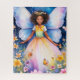 Jigsaw puzzle of a young girl with butterfly wings stands in a vibrant garden, surrounded by colorful flowers and glowing stars. Her dress is multicolored, and she wears a crown of flowers in her curly hair.