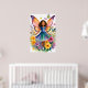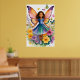 Poster of a young girl with vibrant butterfly wings surrounded by colorful flowers, exuding a sense of magic and whimsy. Her dress mirrors the hues of her wings, matching the bright butterflies fluttering around her.