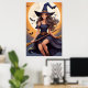 Poster of a cheerful young witch with long flowing hair rides a broomstick in front of a large, glowing full moon. Bats fly around her, adding to the enchanting nighttime scene.