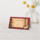 Fantasy knight's sword Jewish Bar Mitzvah tent style place card or escort card. This medieval times fantasy sword and sorcery Bar Mitzvah place card features a red velvet look background, a simulated parchment scroll, a knight's, king's, or prince's sword, and a crown.