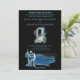 The design is mostly White Indigo Denim Blue for this Fantasy Fairy Tale Medieval Castle and KNIGHT in SHINING ARMOUR kneeling with his SWORD and Medieval CASTLE STAIR WAY Wedding Invitation.