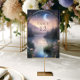 DINNER RECEPTION TABLE NUMBERS | Fantasy style moon over a lake, with starry sky and misty mountain forest scene. Beautiful tall pines in the background, with woodland wildflowers, ferns and foliage over a delicate arched top portal frame with vines making this design so beautiful for a marriage in the mountains. Magical, ethereal from our "Portal to everlasting love" theme. The reverse side has the same scene in full color. A complete set of products are available for purchase in the collection. MSP0111B