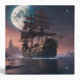A fantastic wooden ship sails away from port, through a rocky channel, under a huge full moon. Beautiful picture, perfect for anyone who loves fantasy and sailing ships.