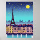 A stylized, fantasy of the skyline of Paris, under a blue, starry sky, with a full moon