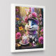 A gorgeous set of 6 magical summer garden high tea party illustrations. There are two featuring whimsical woman with long hair. They are holding a teacup and slice of cake in their hand and are wearing a pretty floral wreath on their heads. The third has a coitak two layer cake platter stand filled with macarons, cakes and gorgeous rose flowers. The fourth and fifth the most adorable magical animals wearing hats adorned with botanical blooms and the sixth an elegant and regal silver Victorian style teapot. All of them are framed by a hidden forest filled with the most beautiful blossoms and soft light. The illustration are done in a cartoon style and this range is perfect for a "mad hatter" tea party; a high tea event or to add a touch of whimsy to your home or office walls.