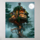 Beautiful vertical poster created using AI rendering software features a mystical, magical, fantasy treehouse on a moonlit night.