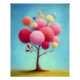 A fanciful tree with a slender trunk stands at the center of this design. The crown is made up of numerous round elements in various sizes, held in shades of pink, magenta, and gold. A fine surface texture gives the circles a soft appearance. The motif is set against a calm blue background above a warm, ochre-colored ground.