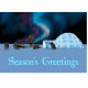 A digital painting featuring an igloo on the polar ice pack, sled dogs and a man in a parka. The northern lights glow overhead. Text reading, "Season's Greetings" appears in glowing blue and white.