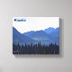 Blue mountains, blue lake water, dark green trees, pink fireweed, and overcast. A depiction of summer in the far north. Customizable text reading "Alaska" also appears. Mosquitos not included.