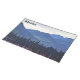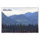 Blue mountains, blue lake water, dark green trees, pink fireweed, and overcast. A depiction of summer in the far north. Text reading "Alaska" also appears. Mosquitoes not included.