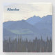 Blue mountains, blue lake water, dark green trees, pink fireweed, and overcast. A depiction of summer in the far north. Customizable text reading "Alaska" also appears. Mosquitoes not included.