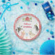 These cute birthday paper plates feature watercolor farm animals with greenery, colorful confetti and a red gingham border.