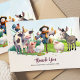 Say thank you in farm-inspired style with this adorable baby shower thank you card. Featuring cute illustrations of barn animals like pigs, cows, sheep, donkeys, geese, and roosters, along with playful Oink, Baa, Moo, and Cock-a-Doodle Doo sentiments. Easily customize it with your party details and make it unique for your special day using the "customize it" button for text formatting and placement options. Additionally, this thank you card is perfect for coordinating with other farm-themed party supplies for a cohesive look and feel to your baby shower celebration. Show your appreciation to your guests in a fun and memorable way with this charming farm animal thank you card.