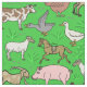 This fun, whimsical farm animal collage pattern fabric shows a hodgepodge of domestic animals / livestock standing in a green grassy countryside landscape. The animals include pigs, cows, chickens, goats, sheep, horses, rabbits, ducks and geese. The style is sort of vintage / primitive with a hand-drawn look, but not really cartoon-like.