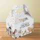 Custom farm birthday party favor boxes featuring a simple white background, celebration confetti, adorable farm animals including a cow, goat, pig, sheep, donkey, horse, rabbit, duck & a rooster, a thank you message, and the childs name & age.