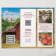 Customize this farm themed business brochure template with your photos, logo and QR code. The tri-fold design contains templates on front and back. Side 1 has a place for the title / farm name / business. Also include a logo on the front page, with one more section of text. Two white panels have barn red text for hours, location and information about the farm or what you sell. The right side panel has a rooster image to replace with your own. Keep, or change, the tomato image and background red barn. Side 2 has a full page photo of a baked pie. Replace it with a photo of your own (if you want). Also add a photo and about section to personalize the advertisement. Fold into thirds.